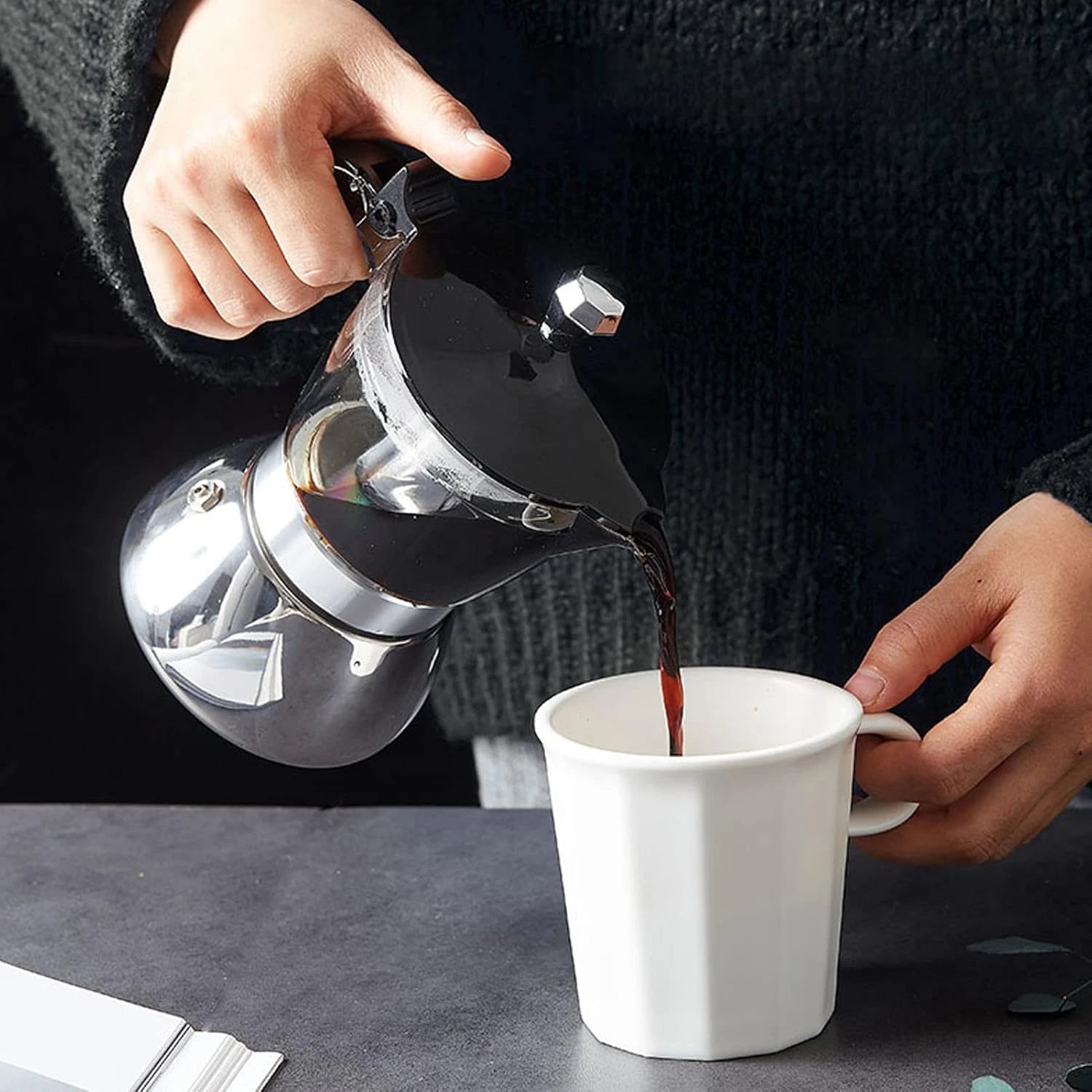 Compacte, légère et simple à prendre en main, la cafetière manuelle prépare un café sans électricité et sans capsule. Selon le modèle, l’usage est possible sur gaz, vitrocéramique ou induction. Le résultat : une tasse au profil aromatique net, obtenue avec une méthode maîtrisée.